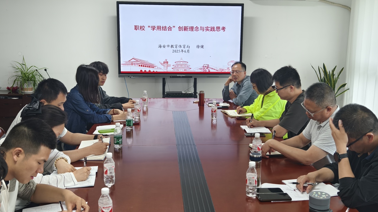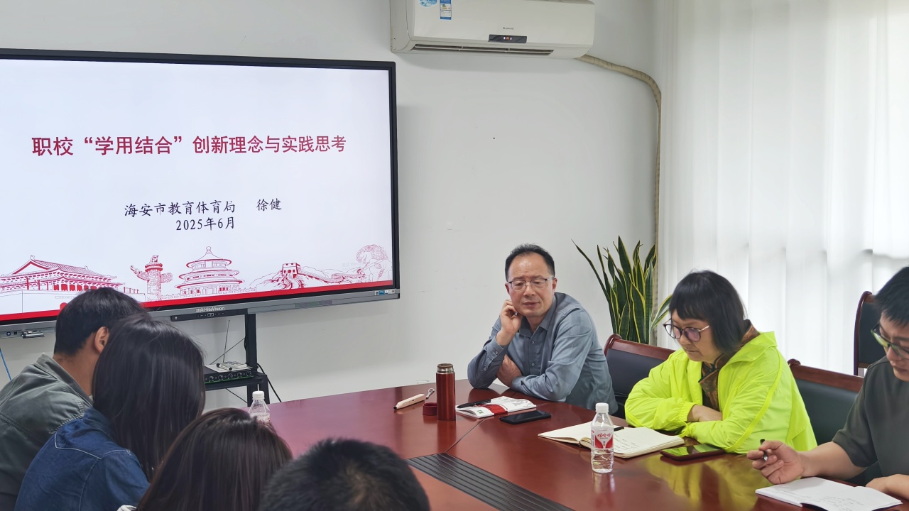 海安市教师发展中心教研员、正高级讲师徐健作《职教‘学用结合’创新理念与实践思考》总结讲座。徐科长从职业教育的基本规律出发,深刻剖析了“做中学、学中做、教学相长”(即“做学教合一”)的理论机理,并结合海安市职业教育发展现状和未来趋势,提出了深化产教融合、优化课程体系等关键路径的实践思考。他强调,创新创业教育是职业教育提质培优的重要抓手,必须坚定不移地推行“项目引导、任务驱动、课赛融通”的教学模式,培养更多具有创新精神和实践能力的高素质技术技能人才。