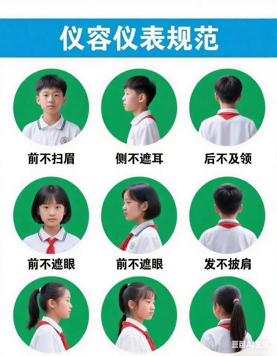 女生:短发或扎马尾辫,前额刘海不过眉,长发需束起不披肩,禁止烫发、染发及使用怪异发饰。