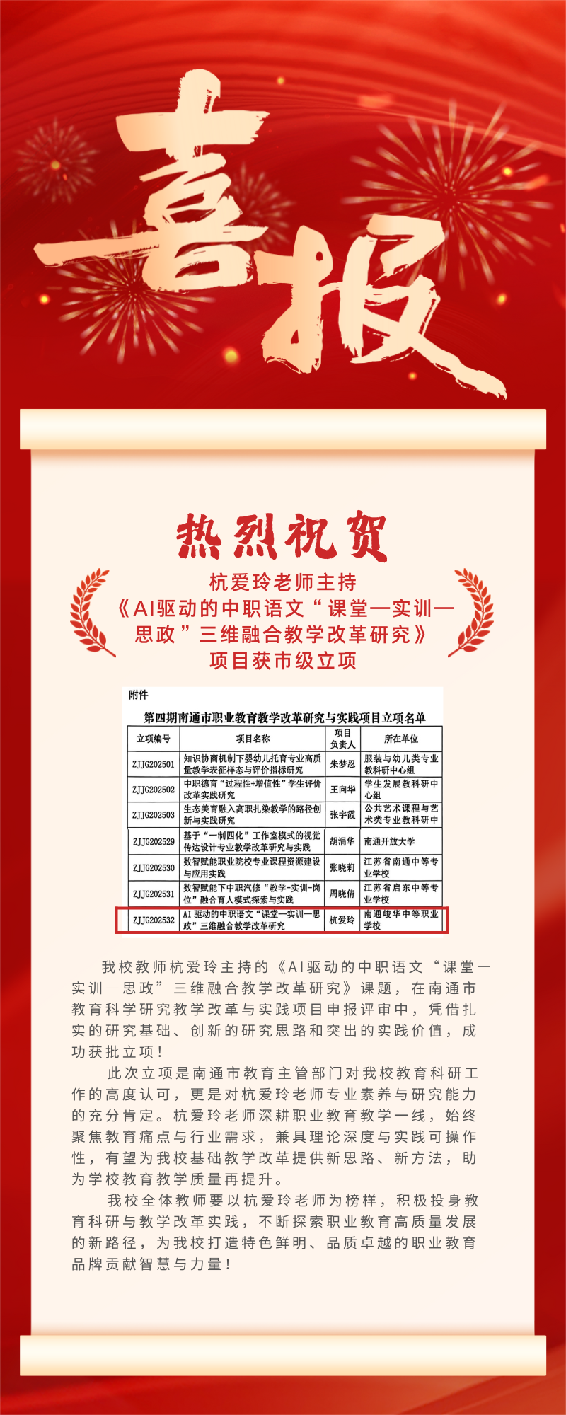 喜报——热烈祝贺杭爱玲老师主持《AI驱动的中职语文“课堂—实训—思政”三维融合教学改革研究》项目获市级立项