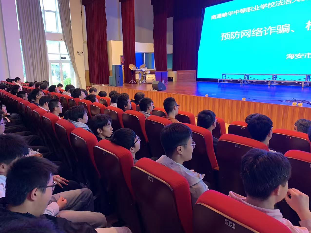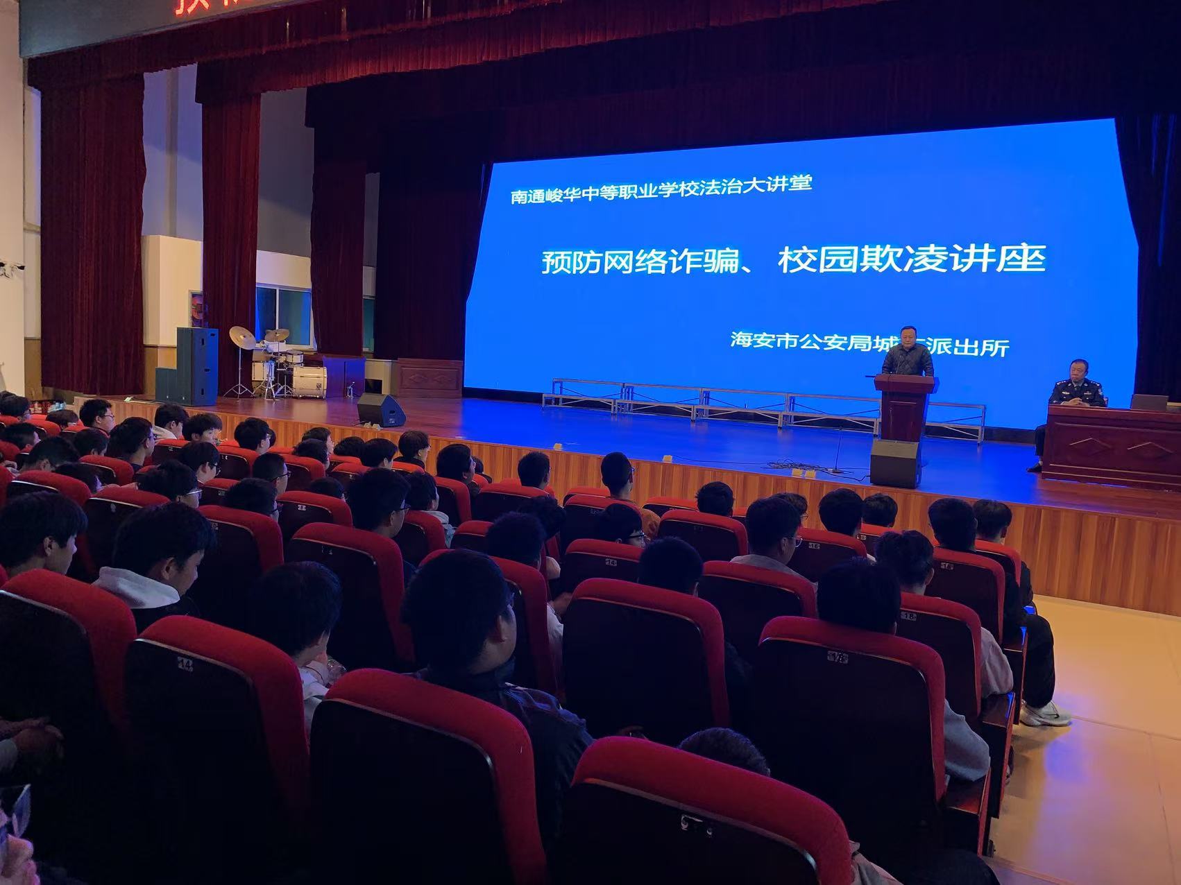 为深入推进平安校园建设,增强学生的法治观念与安全意识,有效预防电信网络诈骗和校园欺凌事件的发生,为青少年健康成长保驾护航。10月22日下午,我校法治副校长海安市公安局城东派出所朱警官到校,为峻华中职学子带来一场生动又深刻的《预防网络诈骗、校园欺凌》法治教育专题讲座。讲座由学工处贾波主任主持。