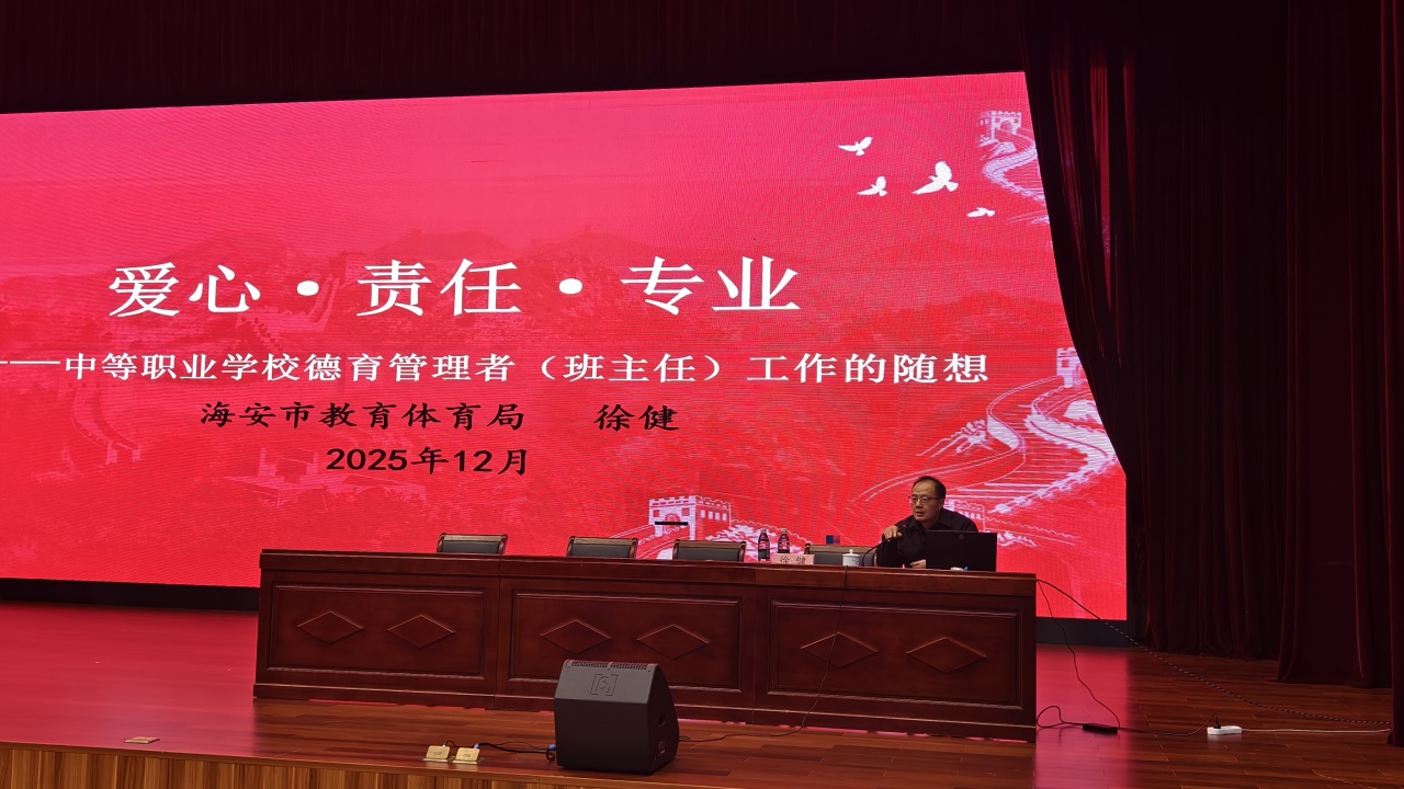 为提升我校德育管理工作水平,强化德育相关人员专业素养,学校特邀请海安市教育科学研究中心教研员、正高级讲师徐健科长12月24日下午在学校报告厅开展《爱心·责任·专业——中等职业学校德育管理者(班主任)工作的随想》专题讲座。学校领导、中层干部、学工处全体人员、全体班主任、生活老师、任课教师共同聆听讲座。