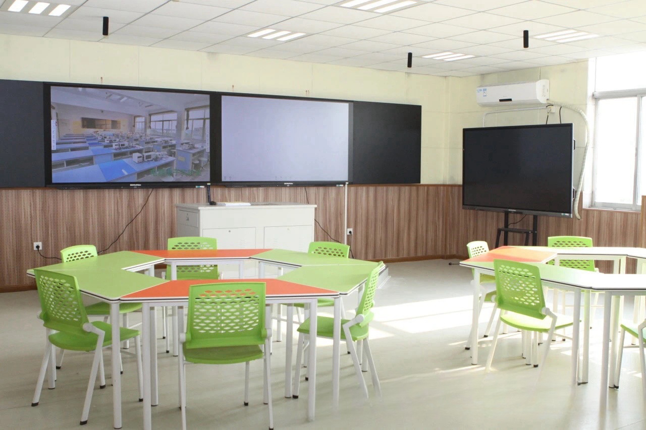 录播室现有录播系统1套、移动触控一体机1台、华硕i5台式机4台。录播教室的单向透视玻璃把录播教室分隔成前、后两间,前面为师生上课用的教室,后面是其他教师听评课的观课室,录播室内上课教室与观摩室相互独立,授课教师可以在不受外部影响的情况下开展教学活动,听课教师在观摩室通过单向玻璃和实时录像关注教学全过程,使上课、听课、评课可以同步进行,提升了听评课的效率。